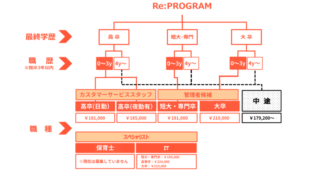 社会人の理想のスタートアップを図れなかった若者が、再び前を向き、自信を持って仕事に取り組み、自身のキャリアをもう一度描くことを応援するプログラムです。学校卒業から3年以内の方でも、新規学卒者と同じ育成・サポート体制をご用意しています。具体的には、4月の新卒入社式への参加や、1か月間の社会人の基礎研修の受講、希望と適性に応じた部署配属やメンター制度やフォローアップ研修など、サポート体制が充実しています。このプログラムを利用する方の思いは、「思ったような社会人のスタートが切れなかったので、もう一度基礎から学び直したい」、「新卒入社の職場で十分に研修を受けられなかったので、もう一度同期と共にキャリアを築きたい」など様々。一般求人の中途採用ではなく、同期と共に社会人のReスタートを切ってみませんか?