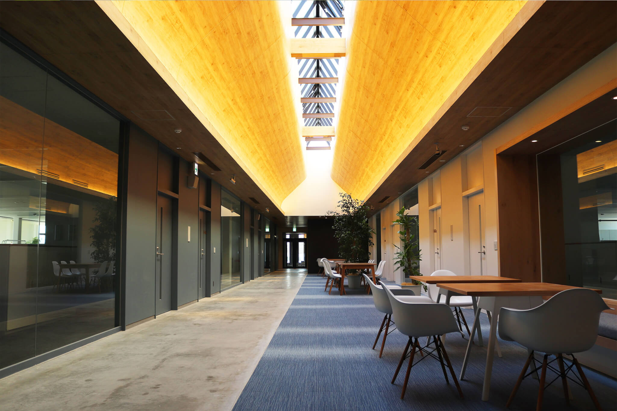 2019年10月にオープンしました。0歳~5歳までの最大42名のお子様のお預かりが可能です。窓を大きく設置しており、中の様子がよく見え、子育て中のお母さんも子どもが近くにいる環境のもと、安心して働くことができます。またカフェテリアの厨房が見える構造により、食育の観点から調理の様子を見学できるよう工夫がされていて、お子様への食事もカフェテリアより提供しています。