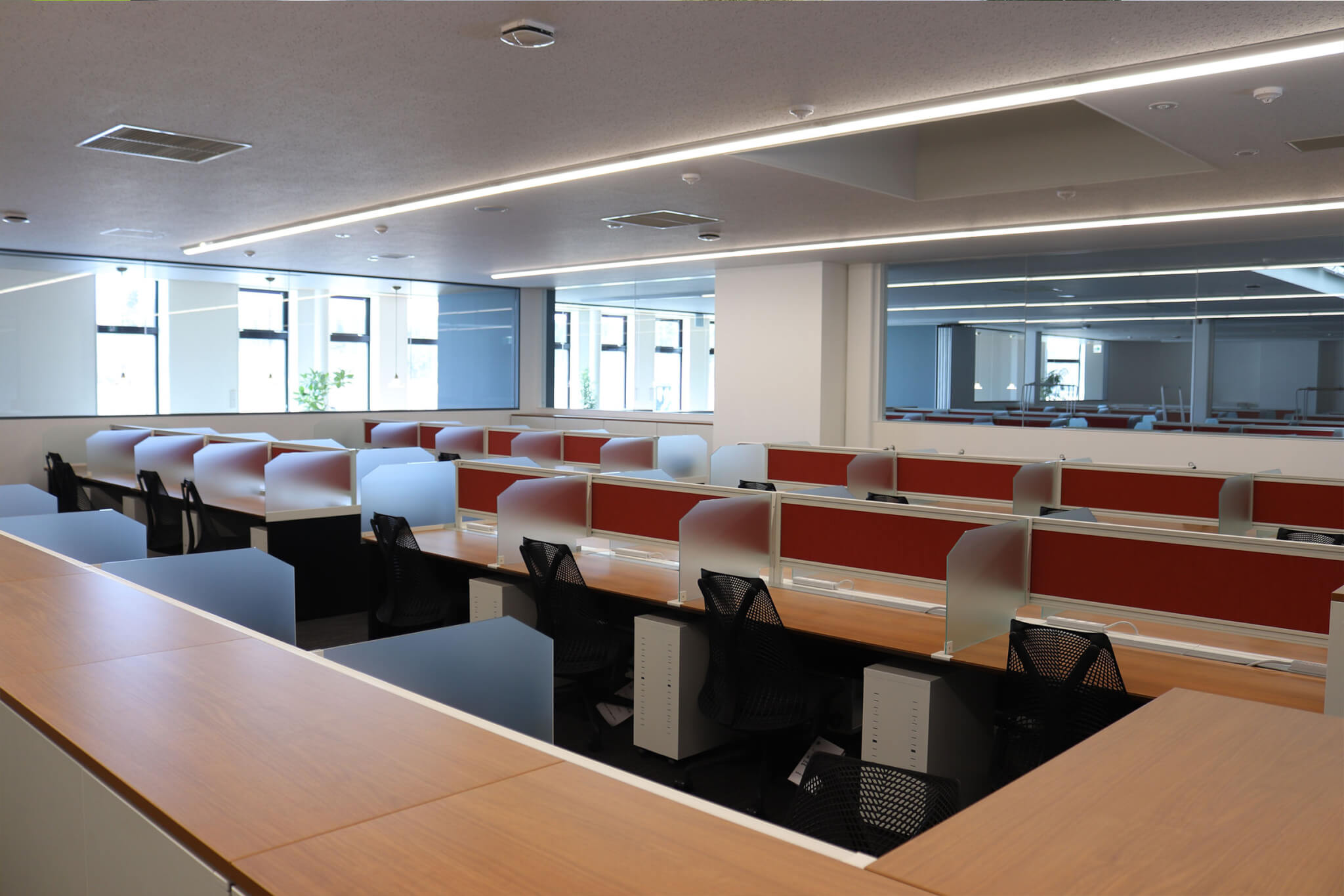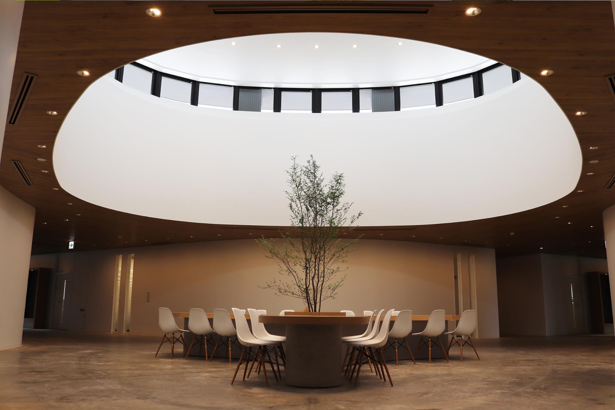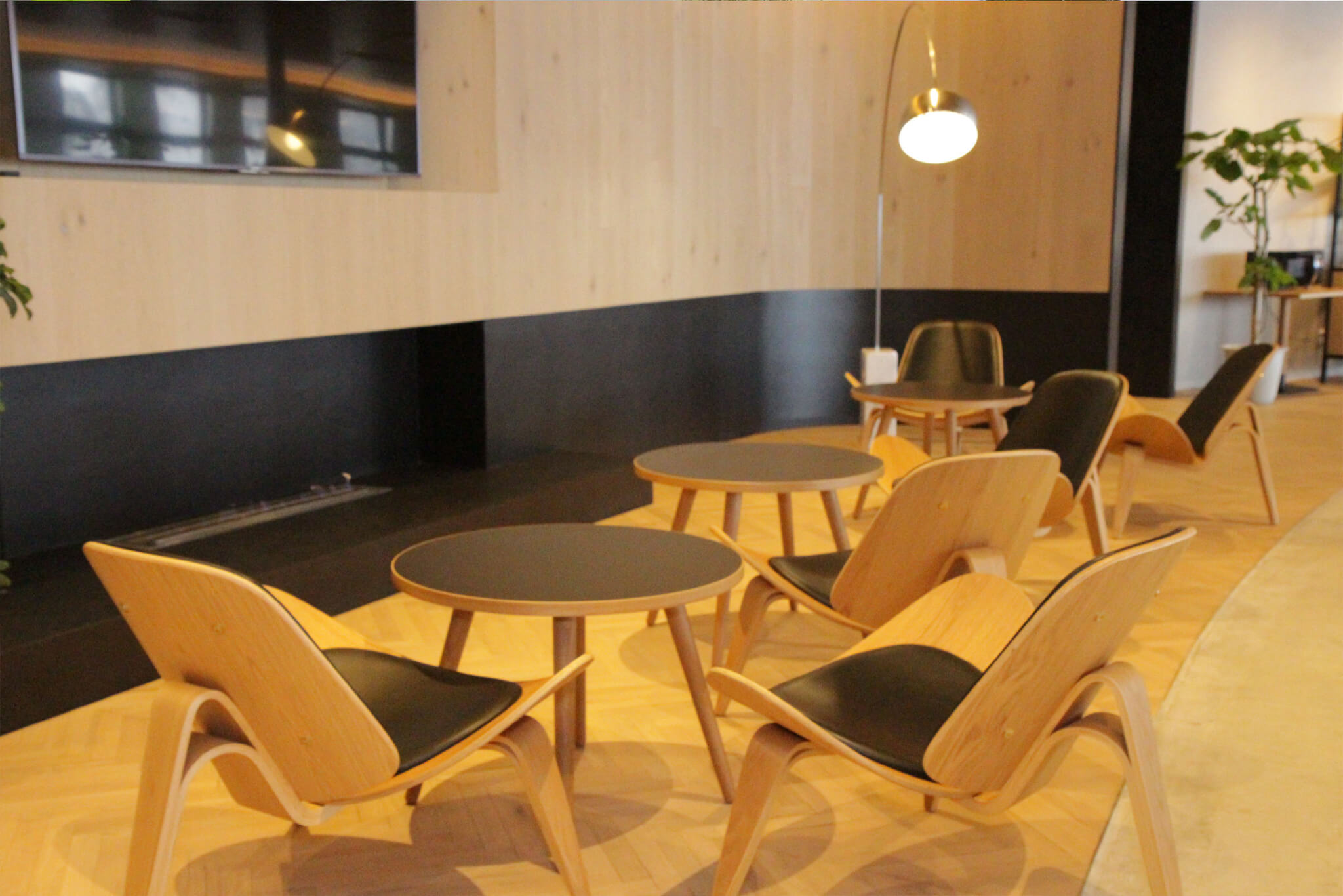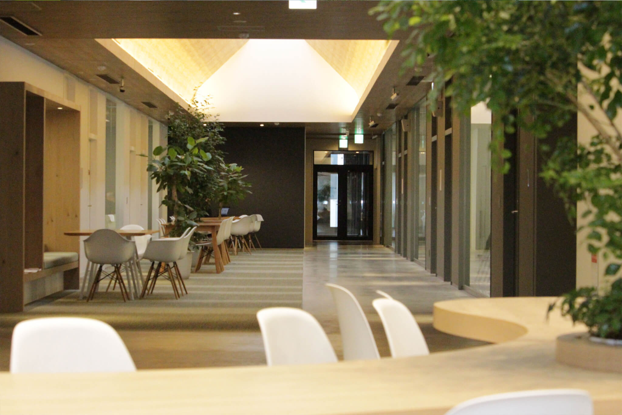 「三つ葉のクローバーの下で咲く笑顔」をイメージして作られた社屋は、木洩れ日が差し込む穏やかな空間。