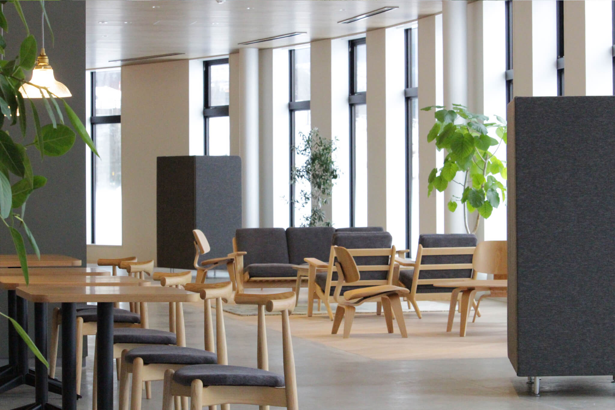 158席ある“CLOVER CAFE”は、全拠点の中でも一番の広さと席数を誇っています。健康面・栄養面から献立された4種類の日替わりランチをリーズナブルに美味しく楽しむことができます。カウンターテーブル、ローテーブルなど目的に合わせた数種類の造作家具と暖炉タイプの暖房機を設置していて、従業員が思い思いにくつろげるカフェテリアとなっています。